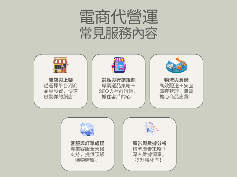 電商代營運或稱電商代操,其實就像請一位全能管家來經營你的網店。服務團隊會幫你從零開始,搞定所有繁瑣的工作。試想一下,如果每天都有專人幫你處理商品上架、行銷策略,甚至廣告投放,當你的顧客下單後,物流安排、顧客服務通通有人處理,是否覺得省下好多時間?